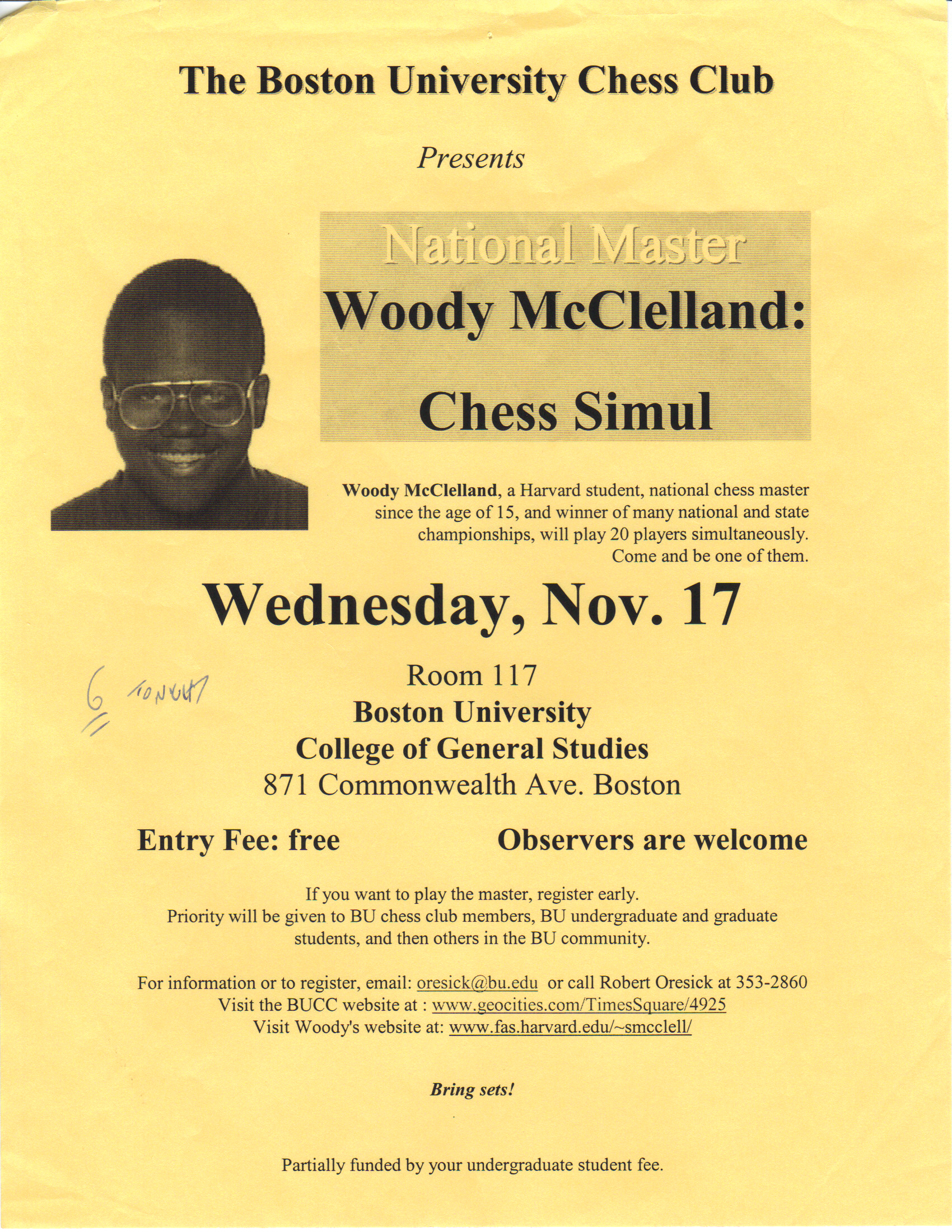 This is an advertisement for a simultaneous exhibition I was invited to give at Boston University in 1999; by the grace of God, I was able to win all of my games.